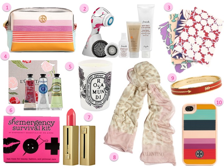 1. Tory Burch Cosmetic Case $55. 2. Clarisonic + Fresh Cleansing System $235. 3. Diane Von Furstenberg Notebooks $29. 4. L'Occitane Hand Indulgences $28. 5. Diptyque Candle $65. 6. Shemergency Survival Kit $25. 7. Guerlain Hydrating Lip Shine $35. 8. Valentino Animal Print Scarf $365. 9. Kate Spade Bangle $58. 10. Tory Burch iPhone Case $40.